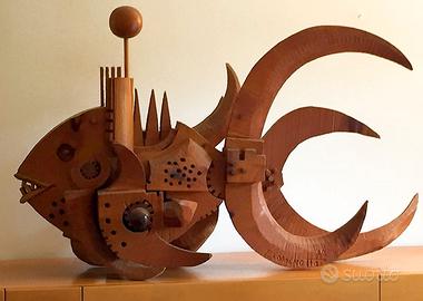 Grande scultura in legno, pezzo unico "Pesce doppia faccia", in legno di cirmolo originale. Unico proprietario, pezzo unico realizzato su ordinazione, anno 1982, firmata e datata 80x56x33 cm.