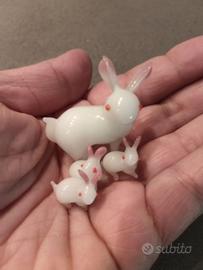 Set di quattro adorabili coniglietti bianchi in vetro vintage realizzati a mano, perfetti per collezionisti o come decorazione.