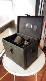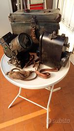 Rarissimo fanale ad acetilene, per segnalazioni ottiche, in uso all'esercito italiano durante la prima guerra mondiale, completo in tutte le sue parti (tranne un coperchio sulla sommità dello stesso, facilmente riproducibile) e della sua valigia per il trasporto (ancora più rara perchè in cartone pressato). Apparecchiatura che può ancora funzionare; sicuramente un "pezzo da museo".