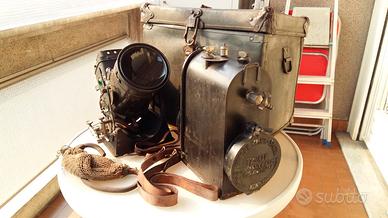 Rarissimo fanale ad acetilene, per segnalazioni ottiche, in uso all'esercito italiano durante la prima guerra mondiale, completo in tutte le sue parti (tranne un coperchio sulla sommità dello stesso, facilmente riproducibile) e della sua valigia per il trasporto (ancora più rara perchè in cartone pressato). Apparecchiatura che può ancora funzionare; sicuramente un "pezzo da museo".