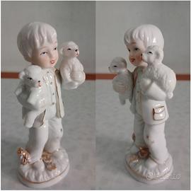 Fanciullino che tiene in braccio due agnellini in Porcellana Bianca e lucida.