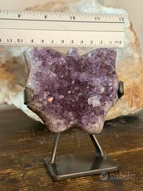 L'ametista è un quarzo viola noto in cristalloterapia per le sue potenti proprietà calmanti, protettive e spirituali. Stimola il chakra della corona, favorendo la pace interiore, la meditazione e l'intuizione, mentre aiuta a ridurre stress, insonnia e ansia. Si ritiene purifichi l'aura e aiuti a superare dipendenze.