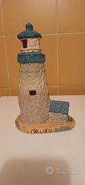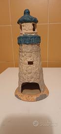Delizioso faro decorativo in terracotta, perfetto per creare un'atmosfera accogliente. - Materiale: Terracotta - con finestrelle e casetta davanti. - Ideale come portacandele Colori grigio, beige e bluette H. 21 base 13