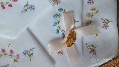 Set di fazzoletti vintage da donna, in cotone bianco leggero, impreziositi da raffinati ricami floreali nei toni del rosa, azzurro e verde. Con scatola originale, stile anni ’60 (scatola in plastica danneggiata). Il set è completo con nastrino decorativo. I ricami sono fini e delicati, in perfetto stile romantico anni ‘50–‘70. I fazzoletti risultano mai utilizzati e in ottime condizioni, senza macchie o difetti evidenti. Materiale: cotone, colore: bianco con ricami floreali a mano, condizioni: eccellenti. Misure: 24x25 cm circa. Prezzo inteso per intero set (trattabile).