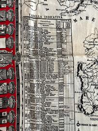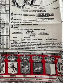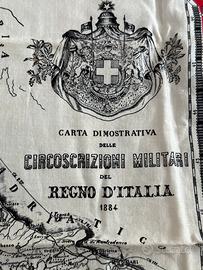 Litografia su cotone (mm 50x60 circa) con bordura con stemmi di tutte le città che facevano parte dei vari distretti militari, al centro grande carta geografica dell'Italia, anno 1884. Interessante documento finemente impresso su cotone (in perfetto stato di conservazione, a colori brillanti).