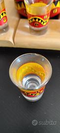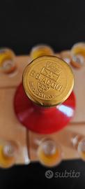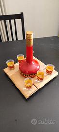 Vendo bottiglia FB Acqui con 6 bicchierini. Bottiglia sigillata, bicchieri integri, solo uno con lieve sbeccatura come visibile in foto, su supporto di legno originale.