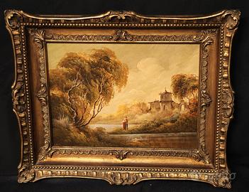 Dipinto a olio su lamiera firmato “Febor”, raffigurante un paesaggio romantico con coppia di figure lungo il fiume e architettura di gusto mediterraneo sullo sfondo.
