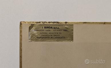 Al verso dell'opera, sul cartone di protezione è presente l'etichetta "I. Binda S.p.A. - Besozzo 1906 - Milano 1981 - Opera grafica di Federica Galli - Serigrafia su argento"