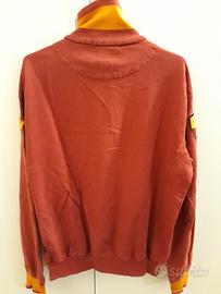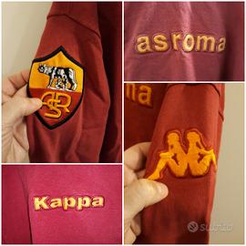 Felpa in cotone della Roma anni 2000, marca Kappa made in Turchia tg L (ascella 59 cm circa; lunghezza maniche da polsino ad attaccatura colletto 81 cm circa; altezza 69 cm circa). Le scritte del club e Kappa davanti sono ricamate in rilievo sul tessuto. Il logo Kappa su manica sx e quello del club su manica dx sono ricamati in tessuto e termoapplicati. Articolo usato che presenta segni del tempo e precisamente il colore lievemente sbiadito per via dei lavaggi, ma in generale è in ottime condizioni generali e ben tenuto.