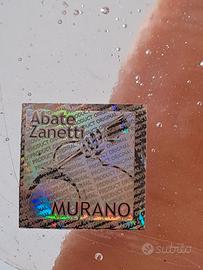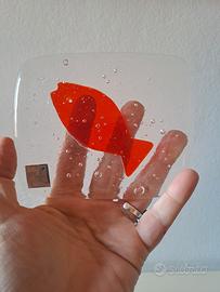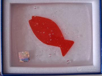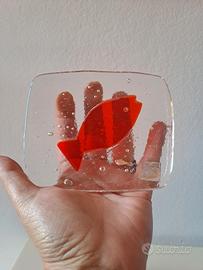 Fermacarte da appoggio in vetro trasparente con bolle tipo acquario con pesce rosso design Abate Zanetti misura 12 x 10, spessore circa 3 mm.