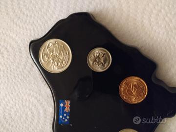 Originale fermacarte vintage a forma dell’Australia, in resina nera lucida con 6 monete australiane fior di conio incastonate (da 1 cent a 50 cent), raffiguranti animali tipici del continente. Al centro c’è la bandiera australiana. Può essere appeso grazie al gancio sul retro. Prodotto da Crystal Craft - Gold Coast, raro e da collezione.