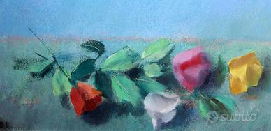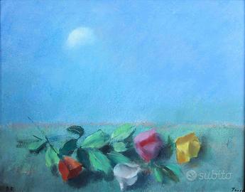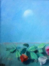 QUADRO AD OLIO SU TELA 40X50 DEL 1985 POCHI ANNI PRIMA DELLA SUA DIPARTITA. A MIO AVVISO SPLENDIDO QUESTO QUADRO CHIARISTA CON ROSE AL CHIARO DI LUNA. CON CORNICE E PASSEPARTOUT MISURA CM 58X68. PER CHI E' SU ROMA E PER CHI VOGLIA IL RITIRO SARA' DI PERSONA CORNICE COMPRESA, IN CASO DI SPEDIZIONE INVIO SOLO TELA.
