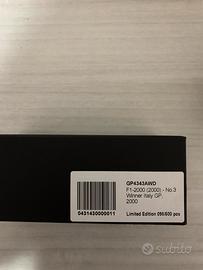 Modellino prodotto da Gp Replicas in edizione limitata della Ferrari campione del mondo di Michael Schumacher vincitore del gp d’Italia del 2000. Pezzo n. 98/500.