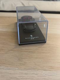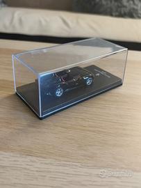 Il modello è protetto da una teca trasparente in plastica rigida nella parte superiore e da una base nera con logo Ferrari e nome del modello in evidenza.