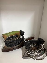 Coppia di ferri da stiro vintage. Uno di questi é dotato anche di un poggia ferro.