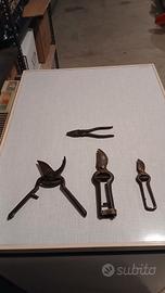 Tre forbici da potatura e una pinza. Usate e vecchissime. Come ferrovecchio sono ottimamente conservate, le forbici tagliano, non come le nuove naturalmente, sono per persone che amano cose e attrezzi di altri tempi. Peso totale gr. 1100. Prezzo per tutte.Misure: