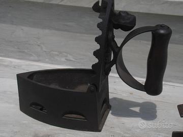 FUSIONE IN GHISA - CON TESTINA LIBERTY DI FERMAGLIO CALDAIA , benissimo conservato, adatto ad ambientazioni , fioriera, fermolibri/porta, reggichiavi, e tuttavia, volendo, ancora utilizzabile. Risale all'inizio del '900, elegante, non di uso popolare. Un originale fermaglio per la caldaietta a braciere rappresenta una testina femminile, l'impugnatura è di legno sagomato alla mano, la fusione sul coperchio mostra eleganti motivi liberty.