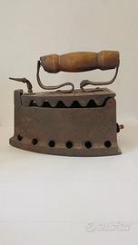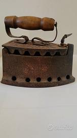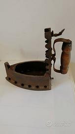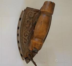 Antico ferro da stiro in ghisa con impugnatura in legno, motivi a bassorilievo .