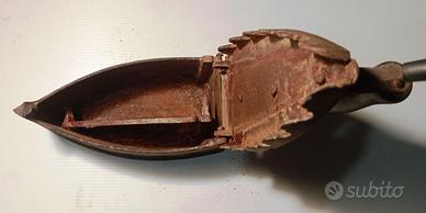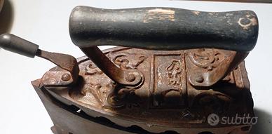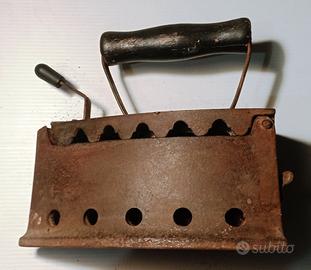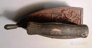 Ferro da stiro in ghisa e legno anni 50 con alimentazione e carbone. Presenta delle macchine di ruggine. Mancante uno dei cardini dell'apertura che perònon pregiudica la stessa.