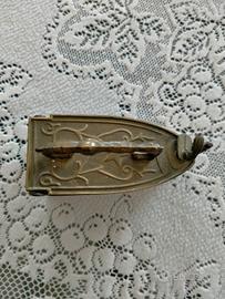 Simpatica riproduzione in ottone degli antichi ferri a carbone usati dalle nostre nonne per stirare quando nelle case non c'era l' energia elettrica .