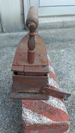 Ferro da stiro a brace , molto particolare oltre la chiusura non tradizionale a anche la porteletta sul retro x dare aria alla brace, un rialzo dell'inpugnatura maggiore molto diversa dei ferri a brace anni 20 tradizionali ..