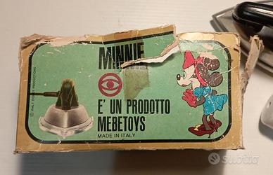 Ferro da stiro giocattolo, vintage, Me.Be funzionante con piastra d'appoggio. Cartone originale Minnie con segni del tempo e lacerazioni diffuse.