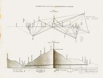 BELLISSIMA CARTINA CON IL TRACCIATO RECANTE I PUNTI DI COLLIMAZIONE PER LE TRIANGOLAZIONI, ED IL PROFILO CON I VARI “OSSERVATORI” DISPOSTI PER L’ALLINEAMENTO DELLO SCAVO DEL LEGGENDARIO “TRAFORO DELLE ALPI”; FORMATO CM. 41 X 31 SU CARTA DELL’EPOCA … DI 134 ANNI FA!
