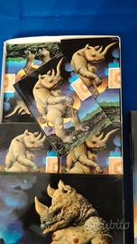 3 confezioni in ogni confezione ci sono 8 fiammiferi da collezione Saffa con illuminazione di un rinoceronte antropomorfo di Lorenzo Alessandri
