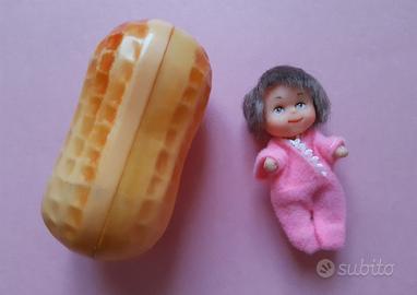 Mini bambolina contenuta in una scatolina di plastica a forma di arachide.