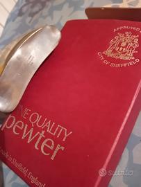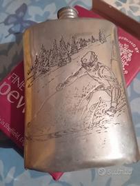 fiaschetta tascabile (con scatola originale) per liquori con immagine di sciatore. Tecnica a sbalzo . Made in Sheffield. Preferirei ritiro a Milano san Siro. In caso spedisco.