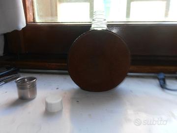 Fiaschetta da viaggio per alcolici (cognac, wisky, grappa). Usata poco ed in ottime condizioni. Confezione foderata di materiale similpelle. Sulla parte esterna in rilievo una macchina anni 20 cabrio. Dotata di tappo interno e di tappino/misuratore esterno per bere. Vedi foto.