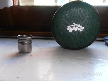 Fiaschetta da viaggio per alcolici (cognac, wisky, grappa). Usata poco ed in ottime condizioni. Confezione foderata di materiale similpelle. Sulla parte esterna in rilievo una macchina anni 20 cabrio. Dotata di tappo interno e di tappino/misuratore esterno per bere. Vedi foto.