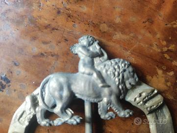 Metto in vendita questa imponente fibbia circolare in ottone, proveniente da una storica fonderia del bolognese. Si tratta di un pezzo di notevole presenza fisica (8x8 cm per oltre 66 grammi), che raffigura un leone passante in rilievo.