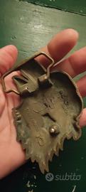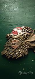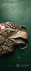 fibbia per cintura da collezione raffigurante un'aquila, marchiata Harley-Davidson. Design: Testa di aquila con bandiera americana, stile vintage biker. Produttore comune: Molti modelli di questo tipo sono prodotti da Baron USA. Materiale: Solitamente in metallo fuso con finitura bronzata o anticata. Stato: Spesso reperibile come oggetto vintage o "New Old Stock" (NOS).