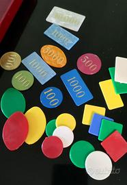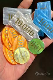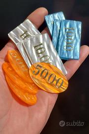 Set Lotto Gioco Gettoni Silk Fiches miste Dal Negro Vintage Made in Italy in lire, assortite, utilizzate per giochi da tavolo classici come Poker, Scala 40, Sette e Mezzo, etc. Alcune, in resina perlata / acrilico madreperlato e valori in oro, italiane di qualità più alta prodotti tra gli anni '50 e '70 (50 pz.). Alcune, prodotte sempre in Italia tra gli anni '60, '70 e '80, sono realizzate in bachelite / acrilico, con i valori (100, 500, 1000, 5000 o 10.000) impressi in oro (76 pz.) e altre hanno solo la forma, senza valori (130 pz.). Totale 256 pezzi.