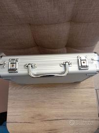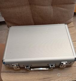 Questo set da poker è un kit professionale completo per giochi come il Texas Hold'em o il Blackjack. La Valigetta è realizzata in alluminio robusto con imbottitura interna in gommapiuma per proteggere i componenti. Include fiches in vari colori (nero, rosso, verde, blu), pesanti circa 11,5 grammi l'una. Il set comprende: 2 mazzi di carte da gioco. 5 dadi rossi trasparenti. Un bottone "Dealer" per indicare il mazziere durante le mani.