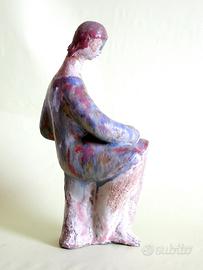Piccola figura femminile: Ragazza in seduta con un barattolo sul grembo. Ceramica con vetrina azzurra, verde, bianca e rossa, cottura a reduzione.