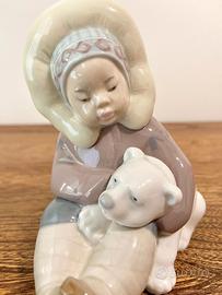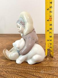 FIGURA IN PORCELLANA DA COLLEZIONE FIRMATA LLADRO Bambino eschimese Inuit che gioca con un cucciolo di orso polare