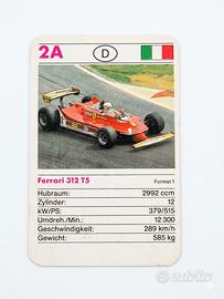 - Figurina adesiva vintage Panini della Ferrari nel suo colore originale. Misure: altezza cm. 8, larghezza cm. 5 - Carta da collezione vintage, proveniente da un gioco tedesco di auto d'epoca (Auto Quartet ). Questa specifica carta (identificata dal codice 2A) è dedicata alla Ferrari 312 T5, la monoposto schierata dalla Scuderia Ferrari per il Campionato Mondiale di Formula 1 del 1980. Sulla carta sono riportate le specifiche tecniche della vettura (lingua tedesca) Misure: altezza cm. 6,5 larghezza cm. 4,5 Buonissime condizioni con qualche impercettibile segno del tempo ( vedi ultime foto).