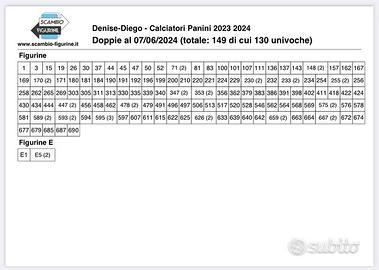 Vendo figurine dei Calciatori 2023-24 in perfette condizioni i numeri disponibili sono nella seconda foto. Il prezzo della figurina è di E0,20 caduna, dalla somma totale va aggiungo il costo del francobollo per la spedizione, per chi è della zona anche di persona. NO ACCETTO SCAMBI