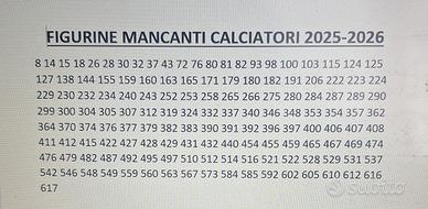 Costo 0,20 a figurina, disponibile eventualmente per scambi. Scrivetemi pure in chat per sapere se la lista doppie/mancanti è stata aggiornata