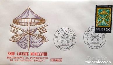 Città del Vaticano 1978 Giro completo di sei buste annullate con i sei annulli per la successione alla morte di Sua Santità Giovanni Paolo I con Giovanni Paolo II - Karol Wojtyla - Materiale Filatelico Storico - Tutte e sei le buste sono tuttora nel loro cartoncino originale con l'immagine di entrambi i Papi. Misure del materiale filatelico 9,5x16,5 cm. Busta n°1 (Morte di Giovanni Paolo I - 28 settembre 1978) Busta n°2 (Sepoltura di Giovanni Paolo I - 4 ottobre 1978) Busta n°3 (Sede vacante - 12 ottobre 1978 per la successione di Giovanni Paolo I) Busta n°4 (Conclave di Apertura - 14 ottobre 1978) Busta n°5 (Elezione del Papa "HABEMUS PAPAM" Karol Wojtyla in Giovanni Paolo II) Busta n°6 (Rito Solenne di inizio Pontificato di SS Giovanni Paolo II "Karol Wojtyla") Storia filatelica rara e graficamente bella. Condizioni di conservazione: nuovo, fresco e, senza diffetti degni di nota
