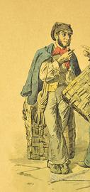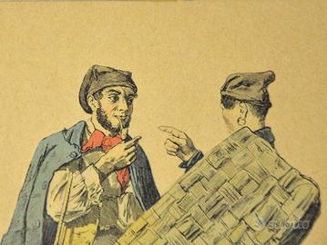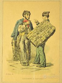 Antica stampa raffigurante due figure popolari napoletane, intitolata “Lazzaroni e Facchini”. La scena, caratterizzata da dettagli realistici e abbigliamento tradizionale, è tratta da un disegno originale del celebre pittore Filippo Palizzi (1818–1899), come indicato dalla dicitura “Fil Palizzi dis.” in basso a sinistra.