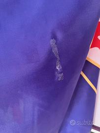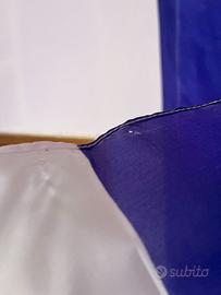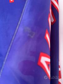 La bandiera era appesa,presenta qualche piccolo forellino del chiodino e posteriormente segni dello scotch.