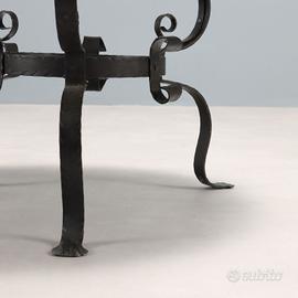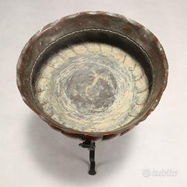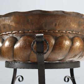 Fioriera con base tripode in ferro battuto e bacile in rame sbalzato.
