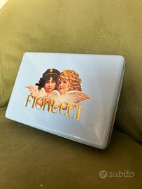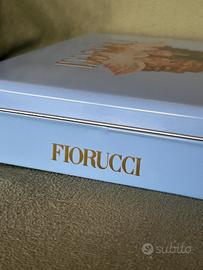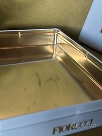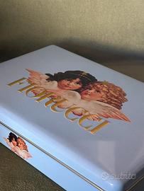 Fiorucci Anni 80 Scatola Latta Moda Vintage Memorabilia. Questa immagine mostra una scatola di latta vintage originale del marchio di moda italiano Fiorucci, risalente agli anni '80. La scatola è di color azzurro pastello e presenta sul coperchio l'iconico logo con i due angioletti (cherubini) e la scritta "FIORUCCI" in caratteri dorati e in rilievo . In origine poteva contenere capi d'abbigliamento come magliette (t-shirt) o accessori venduti nei celebri negozi Fiorucci, oggi è un oggetto molto ricercato dagli appassionati di vintage e "memorabilia" della moda anni '80. Misura 18 x26x5 cm Si trova in ottime condizioni normalissimo segni del tempo e leggerissime botte, ma talmente piccole che non riesco ad evidenziarle in foto .