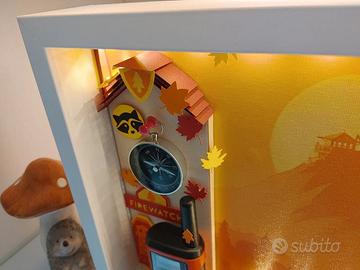 Firewatch-themed shadowbox, frontally protected by a plexiglass panel, backlit with LED lights (customizable light movement), USB rechargeable light controller with the possibility of placing it on a special stand.