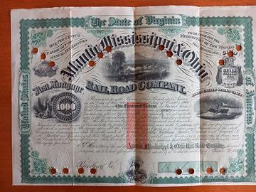 Il generale William Mahone firmò questa obbligazione Gold Bond da $ 1.000, 7% anno, della Atlantic, Mississippi e Ohio Railroad datata 1871, timbro delle entrate interne stampato in arancione al centro, stupende le vignette con treno in alto al centro e due altre vignette ai lati. Il generale Mahone era un presidente delle ferrovie, generale confederato e senatore della Virginia. Il generale Robert E. Lee disse dopo la guerra che tra gli uomini più giovani pensava che William Mahone avesse sviluppato la più alta qualità di organizzazione e comando. Nelle ferrovie dopo la guerra, Mahone creò la Atlantic, Mississippi & Ohio Railroad di proprietà privata. Ne era presidente (in seguito Norfolk & Western) con uno stipendio grande quanto quello dei presidenti. Nella top 10 delle obbligazioni americane più belle di sempre!!! Una grande aggiunta a qualsiasi collezione del sud o confederata. La firma di Mahone è chiara. Colori e grafica eccezionali! Condizioni eccellenti. Il Generale William Mahone (1826-1895) Membro della prima classe di diplomati del Virginia Military Institute (VMI), fu addestrato come ingegnere civile. Contribuì a costruire le strade e le ferrovie della Virginia nei periodi anteguerra e postbellico (ricostruzione). Come maggiore generale dell'esercito confederato, Mahone è noto soprattutto per aver cambiato le sorti della battaglia del cratere contro l'avanzata dell'Unione durante l'assedio di Pietroburgo nella guerra civile degli Stati Uniti. Mahone divenne un leader politico in Virginia, guidò il Readjuster Party e contribuì a ottenere finanziamenti nel 1881 per una scuola per insegnanti che in seguito divenne la Virginia State University. Piccolo di statura, era soprannominato "Piccolo Billy". Nel 1853 fu assunto come ingegnere capo per costruire la nuova ferrovia di Norfolk e Pietroburgo. Senatore degli USA, dal 1881 al 1887, morì il giorno 8 ottobre 1895; fu sepolto nel cimitero di Blandford. Ancora in uso 150 anni dopo!!! Da incorniciare!!!!