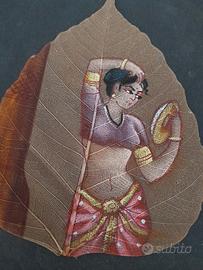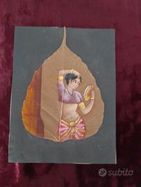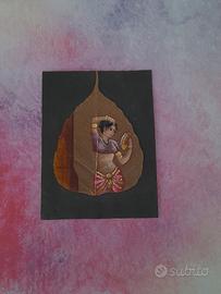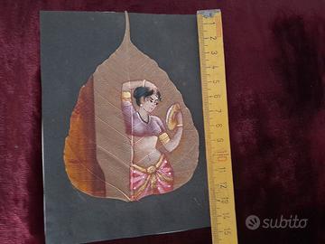 Pittura su foglia di Pipal (Ficus religiosa), antica forma d'arte indiana originaria del Kerala Donna indiana in abiti tradizionali DIMENSIONI Foglia Alta 12,5 cm Larga 9 cm (Sfondo nero 15 cm x 11 cm ) I cartoncini colorati di sfondo non sono compresi, sono puramente dimostrativi. Shringar (Bellezza e Amore) Nell'estetica indiana, lo sguardo allo specchio rappresenta lo Shringar, uno dei nove Rasa (emozioni). Non è vanità, ma il rituale sacro della preparazione. La donna si orna non solo per piacere, ma per celebrare la propria femminilità o in attesa dell'amato. Simbolicamente, rappresenta l'anima che si prepara all'incontro con il divino. Il punto rosso sulla fronte, Bindi (dal sanscrito bindu, che significa "goccia" o "punto"), è uno dei simboli più iconici della cultura indiana e possiede profondi significati spirituali e sociali. Tradizionalmente, un bindi di colore rosso (ottenuto dal sindoor o kumkum) indicava che una donna era sposata, simboleggiando fortuna e prosperità per la famiglia. Secondo la tradizione induista, l'area tra le sopracciglia è la sede del sesto chakra, chiamato Ajna, punto in cui risiede l'intuizione e la visione interiore. L'arte viene realizzata sullo "scheletro" della foglia di Pipal. Le foglie vengono immerse in acqua per circa un mese affinché la clorofilla si consumi, lasciando solo la delicata struttura venosa trasparente. L'albero di Pipal (o Peepal) è considerato sacro in India nelle tradizioni induiste e buddiste, simboleggiando saggezza, longevità e illuminazione (è noto anche come albero della Bodhi). Un angolo dedicato alla meditazione, l'albero di Pipal è simbolo di pace e saggezza Come biglietto d'Auguri Esclusivo, per occasioni speciali matrimoni o anniversari. Sotto il vetro di un tavolino per un tocco etnico e sofisticato. Plastificata con cura per un segnalibro artistico Ultima foto disponibili altri dipinti li trovi in vendita tra gli annunci. Spedizione accurata e veloce SCONSIGLIO Poste italiane 🚫