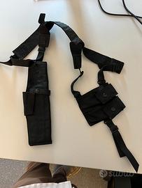 Fondina ascellare in cordura nera con doppio caricatore, adatta per beretta 92/98 con sistema di nastri per l'ancoraggio di accessori, chiusura con sicura regolabile tramite velcro, nastro di fissaggio amovibile alla cintura per una migliore stabilità, doppio porta caricatore per pistola,